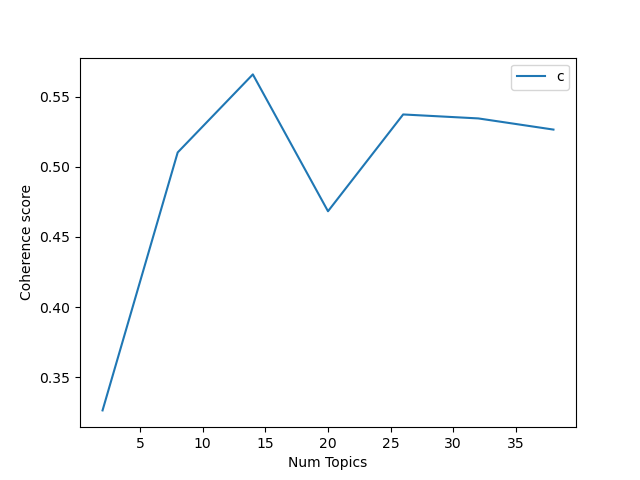 그 결과는 토픽이 14개일 때 coherence 점수가 0.56정도라고 나왔다.