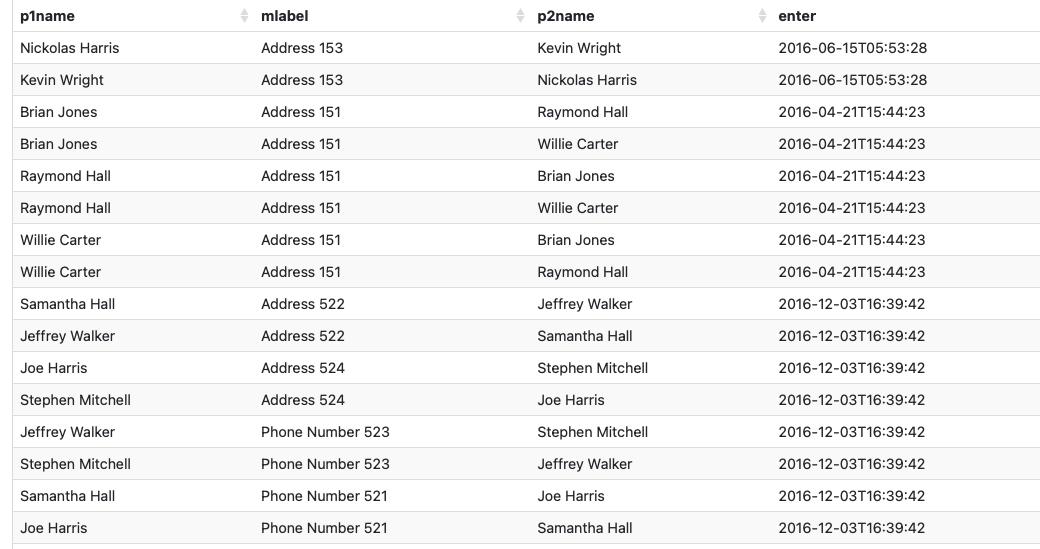 우선 SPARQL 을 통해 전화번호 또는 주소를 공유하는 계정소유자를 찾아보았다.