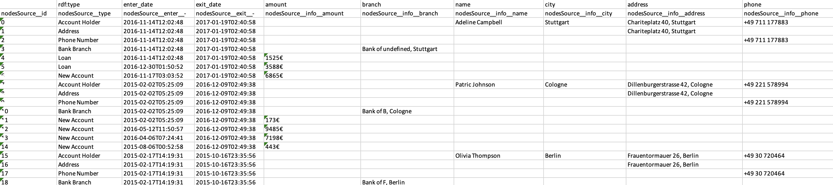 이 데이터의 주요 유형은 계정소유자, 신용카드, 은행지점, 지불, 연락처, 주소, 대출 등의 데이터를 제공하고 있으며, 특정 시점의 데이터가 아니라 enter_date, exit_date 를 통해 데이터의 유효한 날짜를 함께 제공하고 있다.