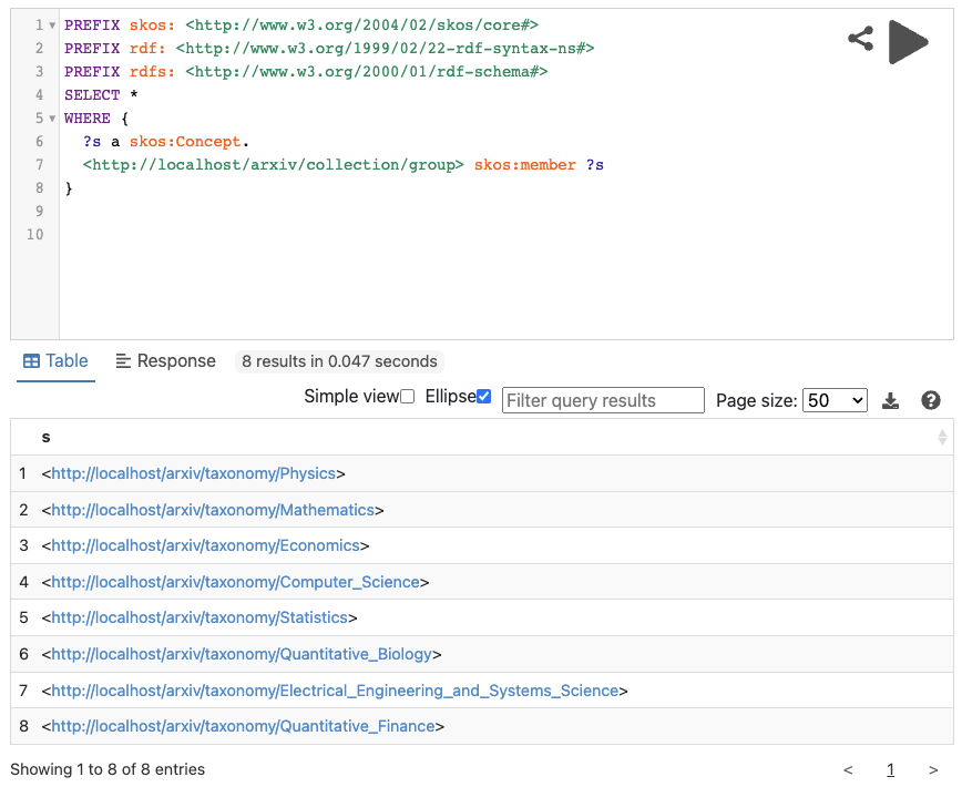 부연 설명이 길어졌는데 다시 arxiv 카테고리 택소노미 데이터로 돌아와 지식 그래프로 구성하도록 하겠습니다. 이 데이터는 데이터 자체로 사용이 가능하고 데이터가 가지고 있는 지식 그 자체를 표현하여 제공하기 위해 SKOS 형태로 구성하도록 하겠습니다. SKOS에 대한 보다 상세한 설명은 https://joyhong.tistory.com/15 을 참조하시면 좋을 것 같습니다. 혹은 공식 웹사이트 https://www.w3.org/2004/02/skos/ 에서 보다 많은 자료를 찾을 수 있습니다.