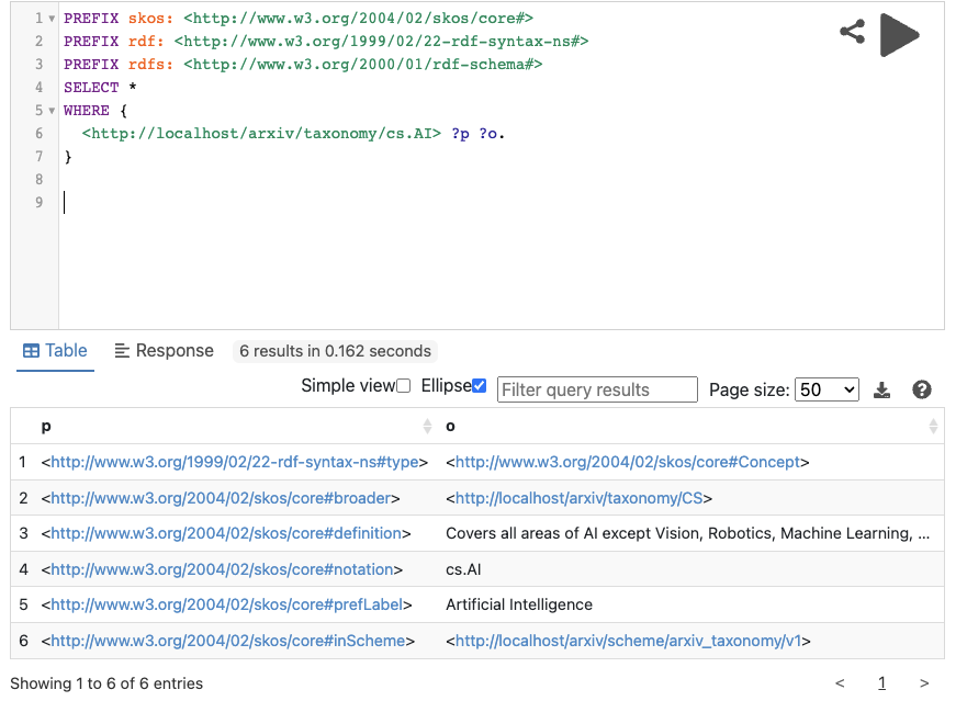 위의 예시는 cs.AI에 대한 정보와 그 상위 Concept, 그리고 ConceptSchem, Collection에 대한 정보들만 일부분 나타내고 있습니다.