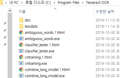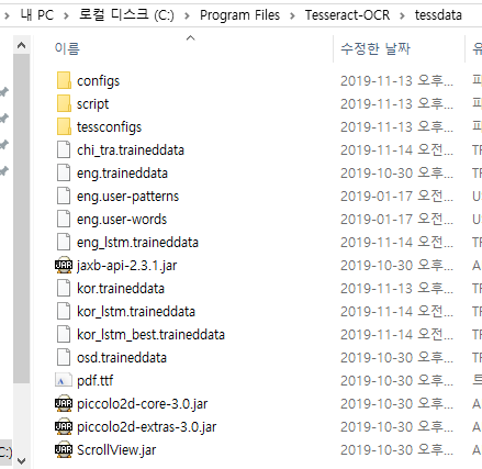 설치과정에서 선택한 언어데이터들이 들어가 있는 것을 확인할 수 있다. 위에서 언급한 바와 같이 다른 언어데이터가 필요할 경우 github에서 해당 언어데이터를 다운로드 받아 이곳에 저장하면 된다.