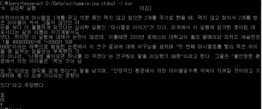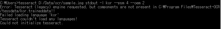 C:\Users>tesseract D:/Data/ocr/sample.jpg stdout -l kor --psm 4