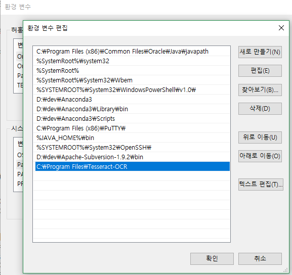 새로 만들기 버튼을 선택하여 위 그림과 같이 Tesseract-OCR 경로를 추가할 수 있다.