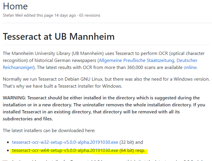 Tesseract-OCR 설치에 대한 정보는 https://github.com/tesseract-ocr/tesseract/wiki 에서 찾을 수 있다.