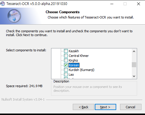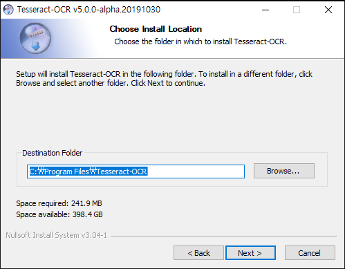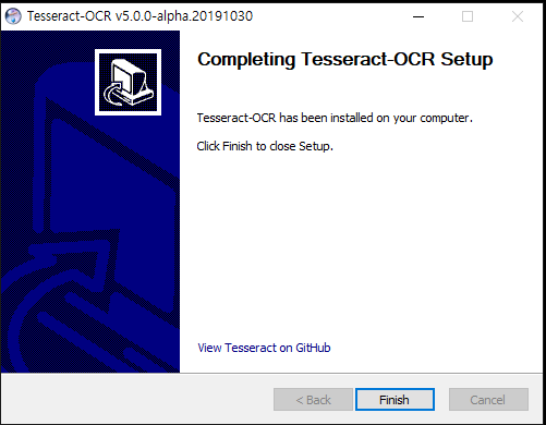 최신 인스톨러인 tesseract-ocr-w64-setup-v5.0.0-alpha.20191030.exe 를 다운로드 받아 실행을 한다.