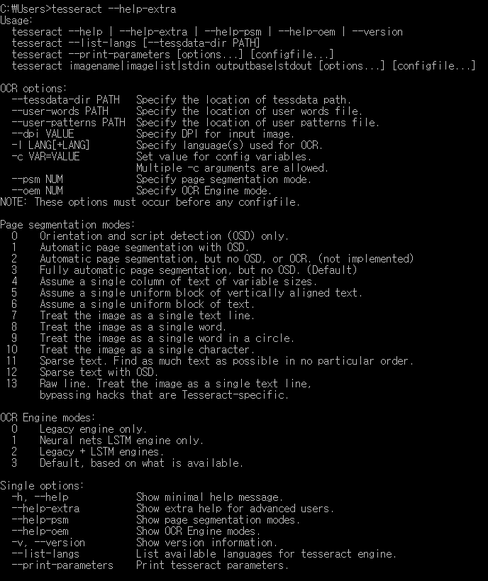 사용법은 Tesseract –help-extra 를 입력하면 아래와 같이 사용법을 볼 수 있다