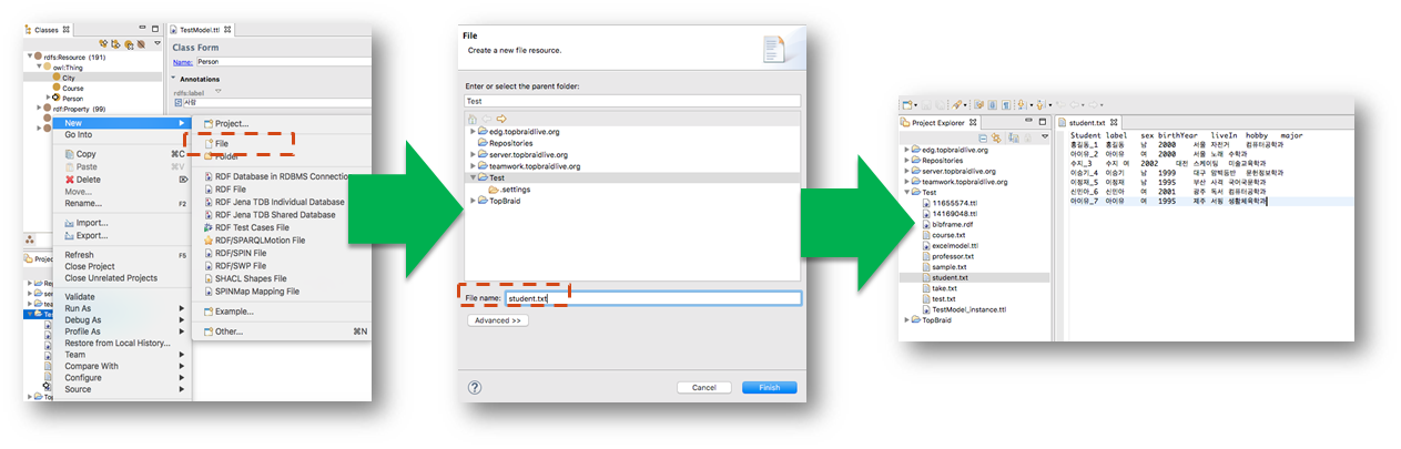 TBC 프로젝트 안에 tsv 파일이 만들어졌다면 온톨로지 모델 파일을 한번 선택해 놓고, 임포트할 tsv 파일에서 마우스 우클릭을 한다. (온톨로지 모델 파일도 TBC 프로젝트 안에 존재한다고 가정한다.)