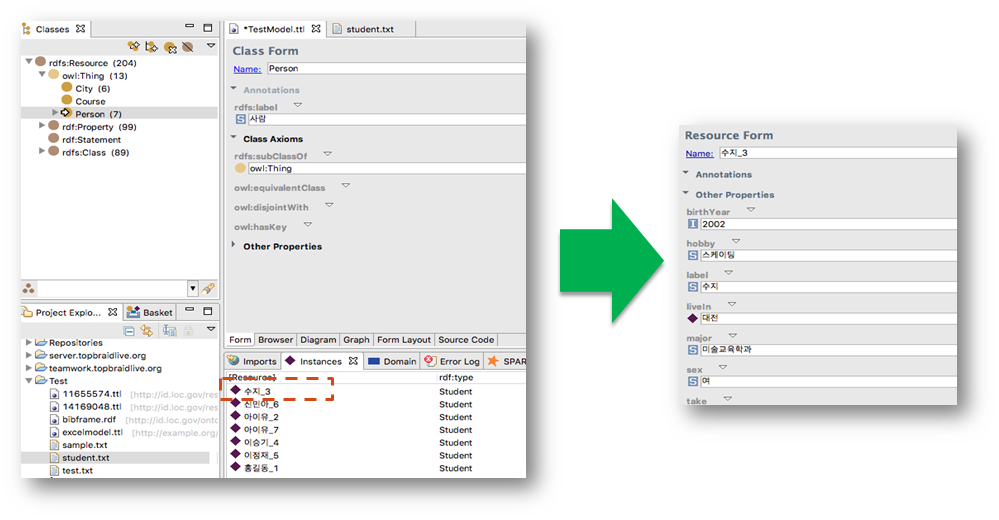 온톨로지에서도 마찬가지로 온톨로지 모델에 맞춰 인스턴스를 생성하게 된다.