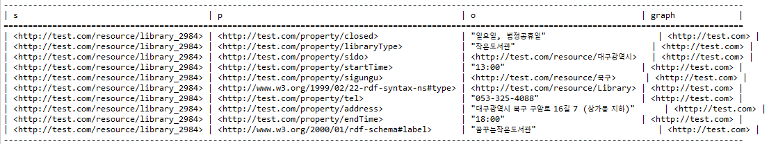 그래프에 적재를 하게 되면 이 포스팅 첫부분에 사용한 SELECT 코드를 그대로 사용할 수 없기 때문에 SPARQL을 약간 수정하면 된다. 왜냐하면 그래프명을 명시하지 않으면 디폴트그래프이고, 그래프명을 명시하면 명시한 그래프명으로 저장이 되기 때문에 원하는 결과가 제대로 나오지 않을 수 있다.