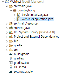 프로젝트가 생성되었으니 src/main/java 하위에 WebTestApplication.java를 열어보면 다음과 같다.