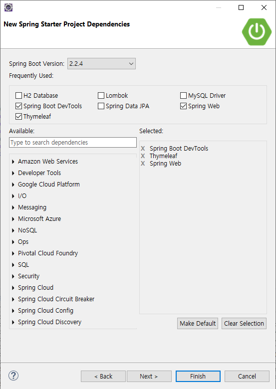 Spring Web은 기본적인 웹 프로젝트를 생성하기 위해 선택하였고