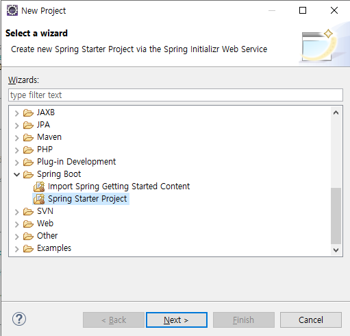 프로젝트 종류는 Spring Boot 폴더에 있는 Spring Starter Project를 선택하고 Next를 누른 후