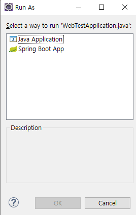 처음이니까 그냥 이 클래스를 실행시켜보자. 이 때 Spring Boot App으로 실행시키면 된다.