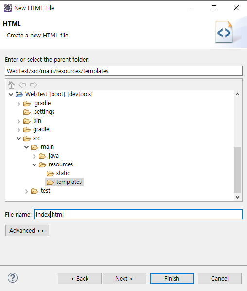 스프링부트에서 HTML 파일은 src/main/resources/templates 폴더에 생성하면 된다.