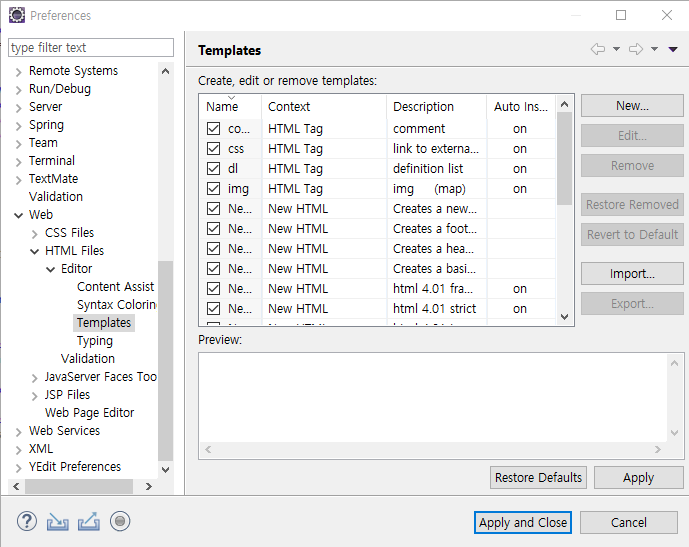 템플릿을 추가하기 위해 New 버튼을 누르고 다음의 화면에서 이름과 패턴을 입력한다.
